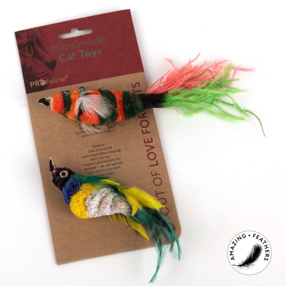 Zestaw 2 kolorowych ptaszków z naturalnych materiałów : sierści jelenia, wełny i piór. Ręcznie wykonane, idealne do dynamicznej zabawy. Długość ok. 15–16 cm.